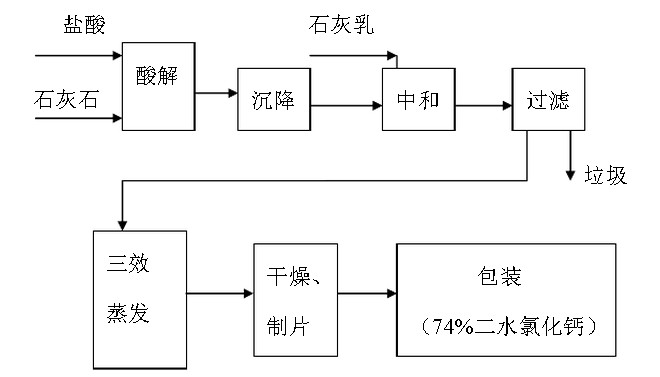 酸法:用 22% 左右的稀鹽酸與石灰石(含鈣 52% 左右) 反應制得 27% 的液體化鈣,經過濾分離把濾渣棄去,濾液用石灰乳進行中和調節, ph=8.9-9 ,氯化鈣溶液中的氫氧化鎂,氫氧化鐵,氫氧化鋁等沉淀,用壓濾機進行過濾,濾餅為固體廢物,濾液進行三效強制循環真空蒸發(加熱至 172 ℃ -174 ℃ 蒸發,經過結晶,分離后于 200 ℃ -400 ℃ 下干燥脫水,既得二水氯化鈣,再將二水氯化鈣加熱至 260 ℃ -300 ℃ ,干燥脫水,即變為白色無水氯化鈣)將 27% 氯化鈣溶液濃縮到 68-69% 后進入結片機進行制片,片狀氯化鈣再進行流化床干燥生產 74% 含量二水氯化鈣